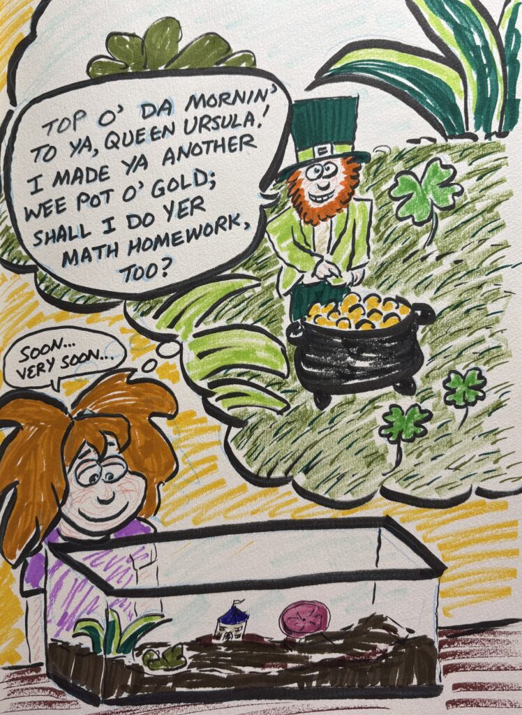 And ever since, anytime Ruth goes on about how Bono helps people, Ursula points out he didn’t help her catch any leprechauns and her teacher gave her a zero on the geography homework because she had someone else do it for her. She’s especially salty about the leprechaun thing as I think her whole plan was to make the leprechaun continually give her pots of gold so she wouldn’t ever have to get a job and therefore could spend her life watching and drawing cartoons.