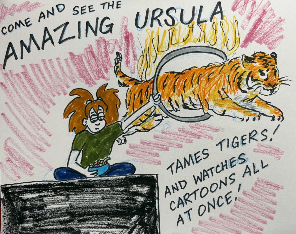 Anyway, “Mr. T-Rex” is upset that none of the channels on Ursula’s TV have much in the way of dinosaur shows. And he’s concerned that Ursula’s gymnastics teacher is boring and won’t teach Ursula the skills she needs for a successful career in the circus.